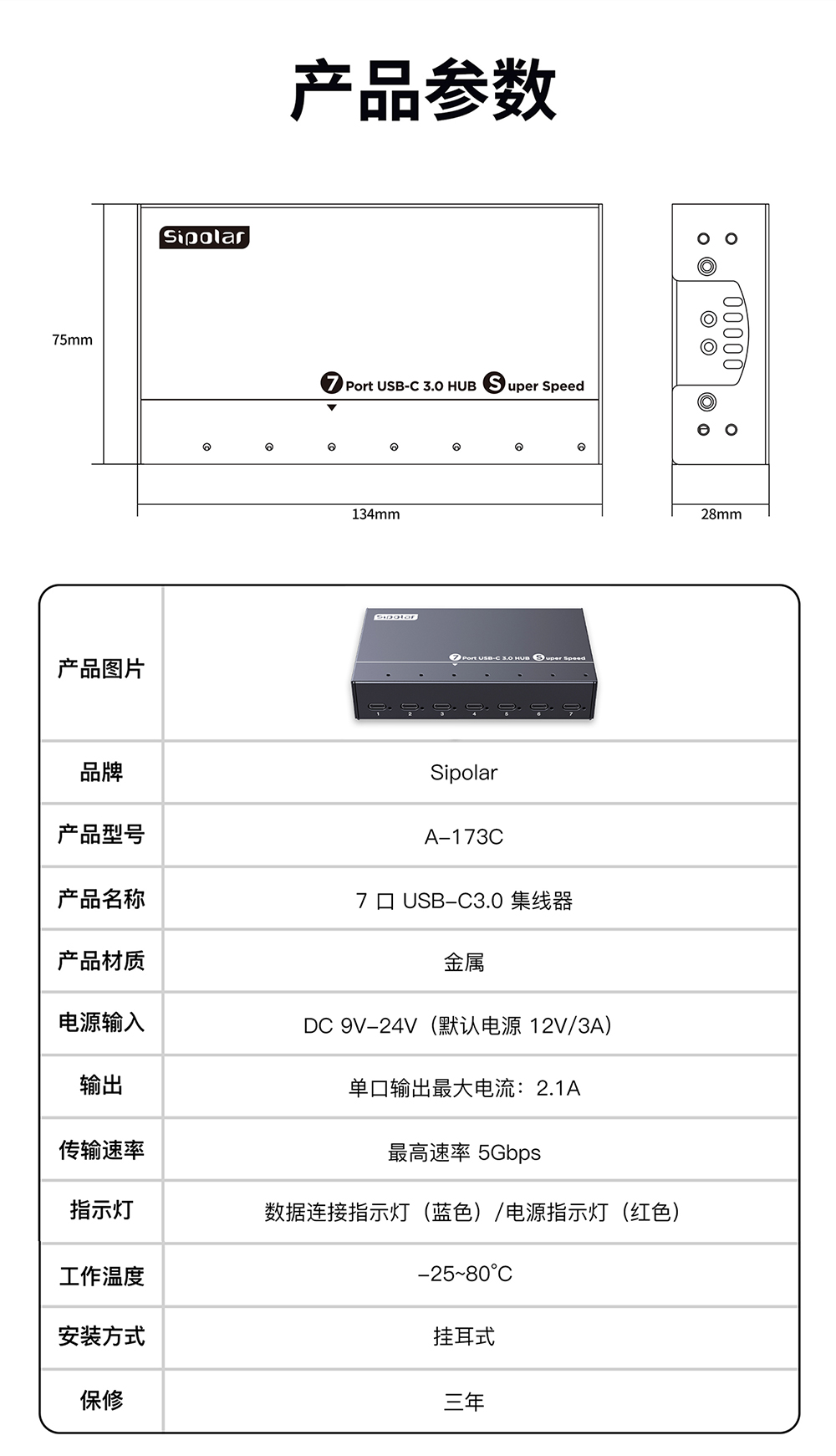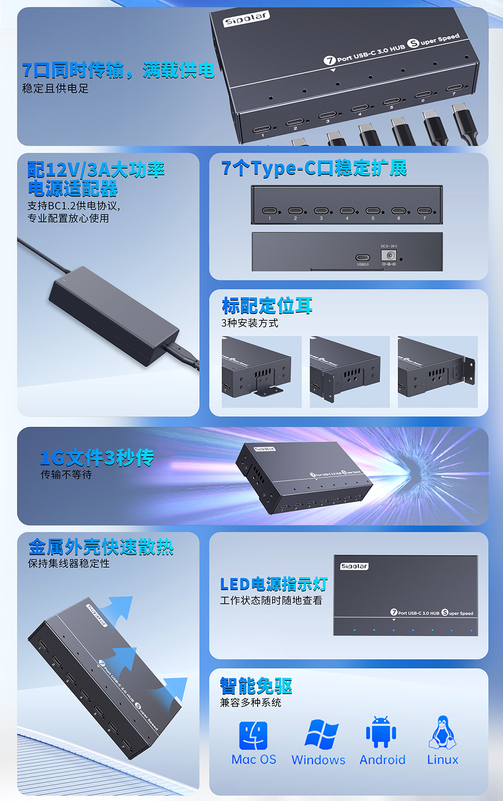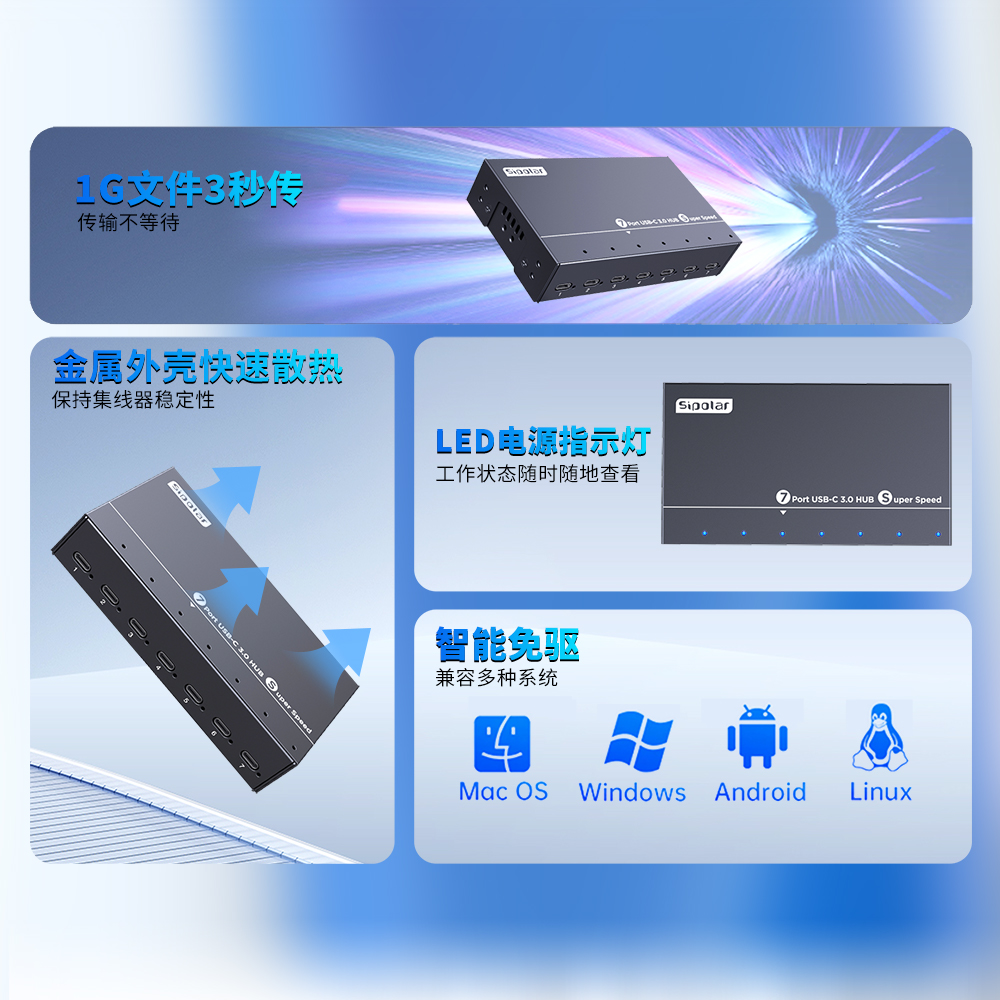 西普莱7口TYPE-C接口 3.0集线器A-173C