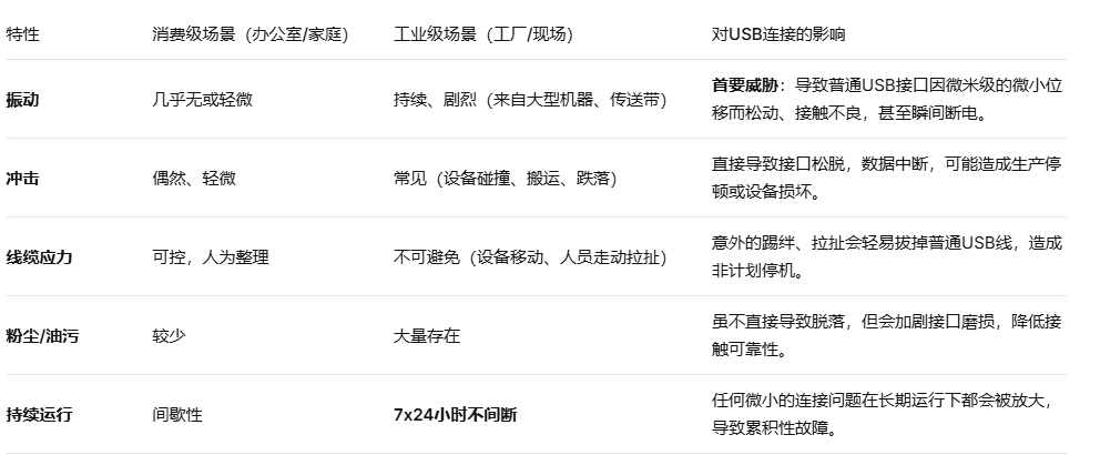 普通USB接口在振动环境中,插头和母座之间会产生微动磨损,长期下来会导致金属触点氧化、接触电阻增大,最终失效。